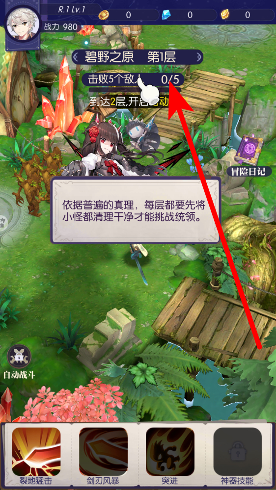 1、進入游戲迷宮層,查看界面上方任務(wù)要求,如碧野之原第1層需擊敗5個敵人,依據(jù)提示清理對應(yīng)數(shù)量小怪,為挑戰(zhàn)統(tǒng)領(lǐng)做準(zhǔn)備。