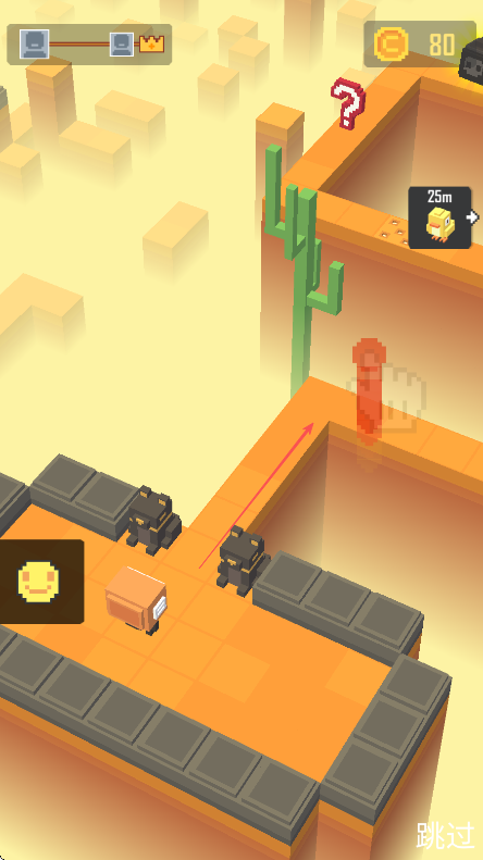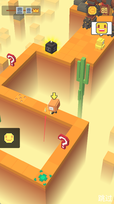 1、進(jìn)入游戲,留意右上角金幣數(shù)量80,操控角色避開黑色怪物,按路線指示移動(dòng)。