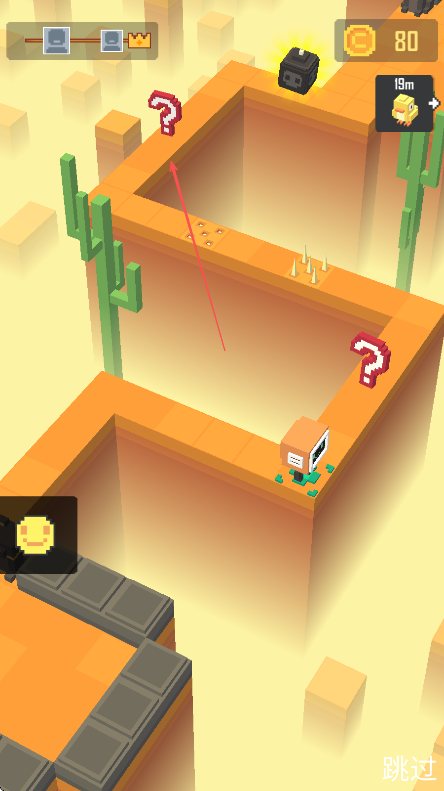 3、前行時(shí)注意躲避地面尖刺等陷阱,利用獲得的道具,朝著終點(diǎn)前進(jìn),過程中收集金幣,完成通關(guān)。
