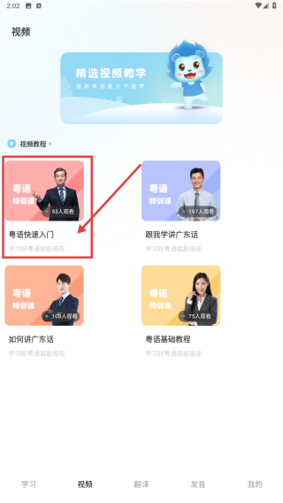 2、在視頻課程頁(yè)面,選擇粵語(yǔ)快速入門(mén)課程卡片,進(jìn)入課程詳情頁(yè)。