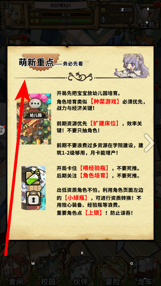 1、開局時,要把寶寶放到幼兒園培育,角色培育類似種菜,需優(yōu)先進行,這對提升戰(zhàn)力和經濟狀況至關重要,是萌新起步的關鍵步驟。