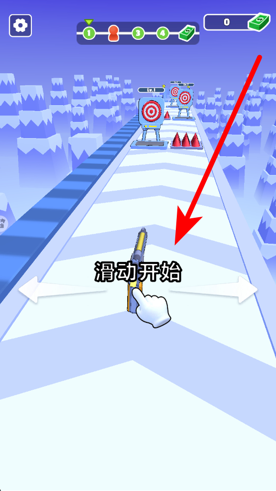 1、開始打開進(jìn)入游戲應(yīng)用后,在起始界面,按照滑動開始的提示,滑動操作讓武器開始在場景中移動,開啟射擊突圍的過程。