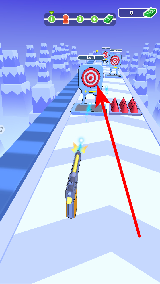 2、在場景中,瞄準(zhǔn)前方的目標(biāo),進(jìn)行射擊操作,盡量精準(zhǔn)命中目標(biāo),以此來推進(jìn)關(guān)卡進(jìn)程,同時要注意避開場景中的障礙紅色尖刺等。
