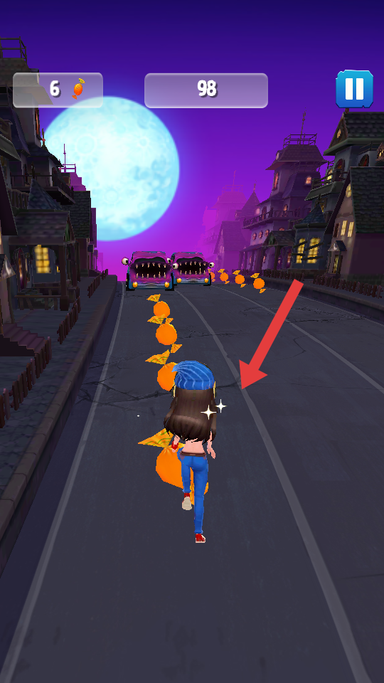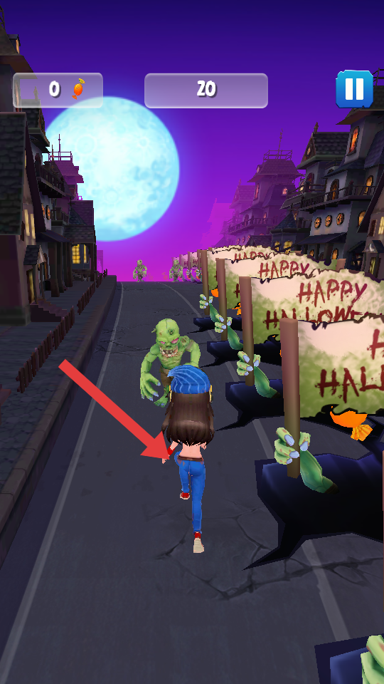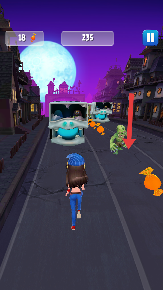 2、核心玩法,在萬圣節(jié)場(chǎng)景中奔跑,需躲避綠色僵尸,、舉牌僵尸等障礙,同時(shí)收集了橙色的糖果。