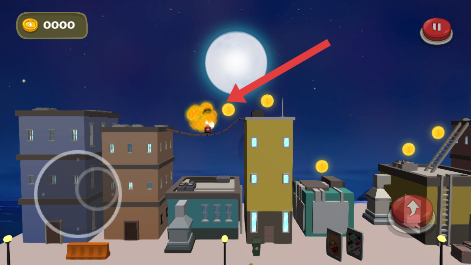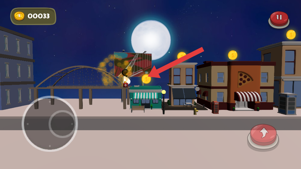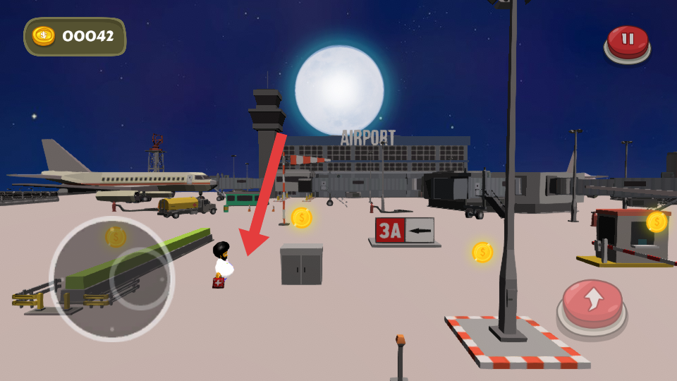 2、在夜晚城市機場場景中移動,收集黃色金幣左上角金幣數(shù)實時更新,如0000→00033→00042;同時可在城市建筑間摸索。