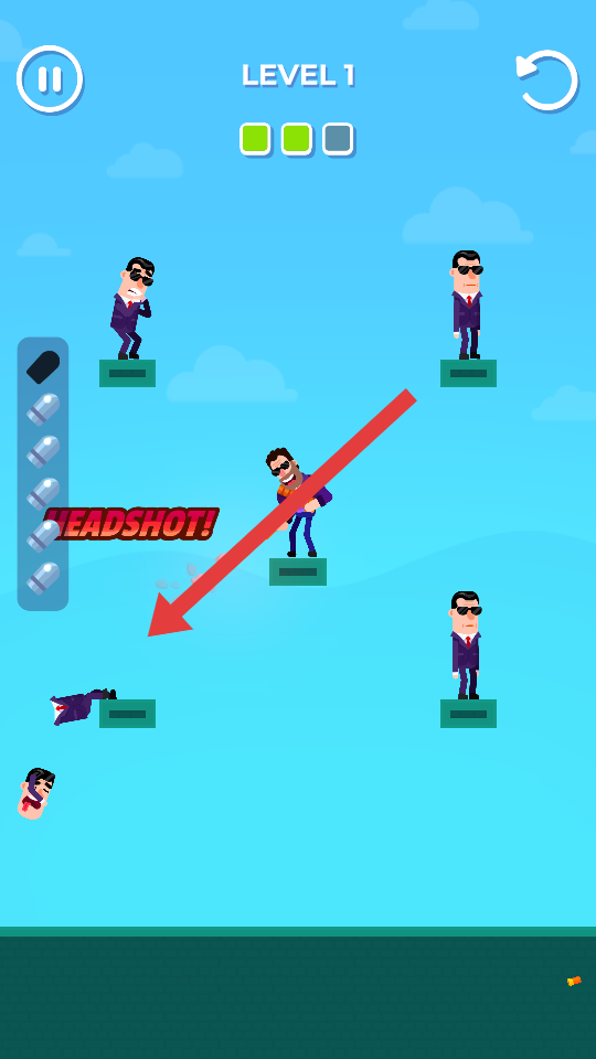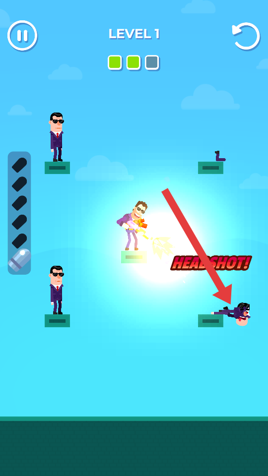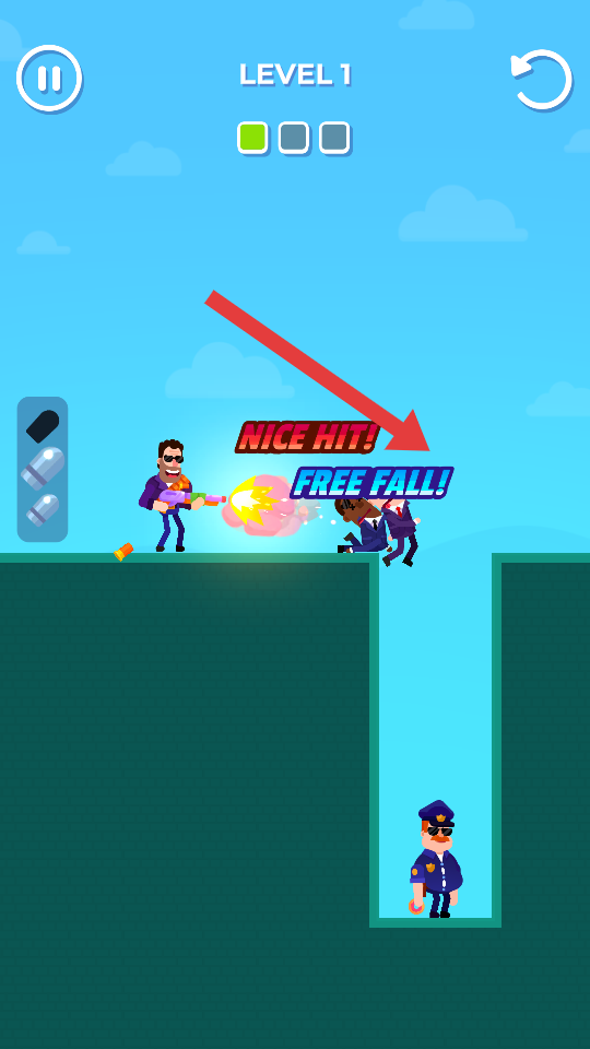 3、留意場(chǎng)景中不同位置的敵人分布,精準(zhǔn)瞄準(zhǔn)并射擊,利用擊落+自由下落的方式,清理敵人通關(guān)。