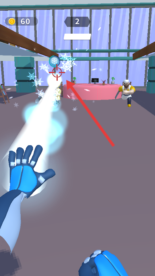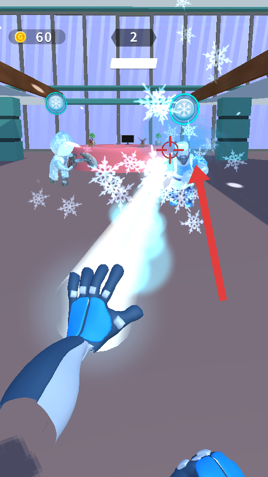 2、瞄準(zhǔn)場景中的敵人來釋放冰雪的技能,需要命中后能夠獲取定量的金幣,同時會推進關(guān)卡的進度。