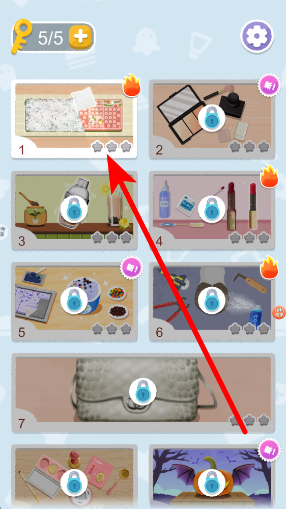 1、開始游戲后,在關(guān)卡選擇界面,能看到多個(gè)帶有不同物品的關(guān)卡,選擇如帶有鍵盤的關(guān)卡,進(jìn)入該關(guān)卡的清潔場景,開啟清潔任務(wù)。