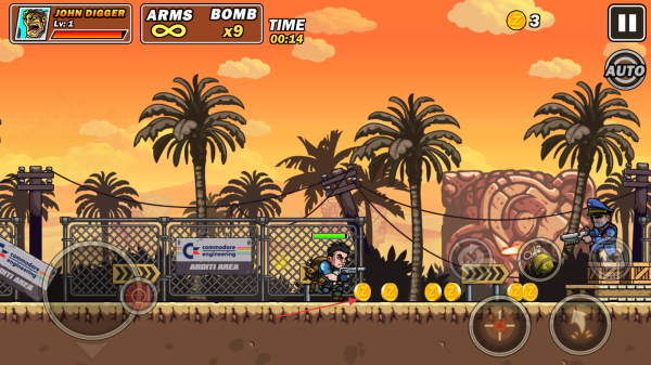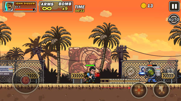 1、進(jìn)入游戲查看左上角角色信息JOHN DIGGER,用左下方虛擬搖桿控制角色移動(dòng),躲避敵人攻擊。