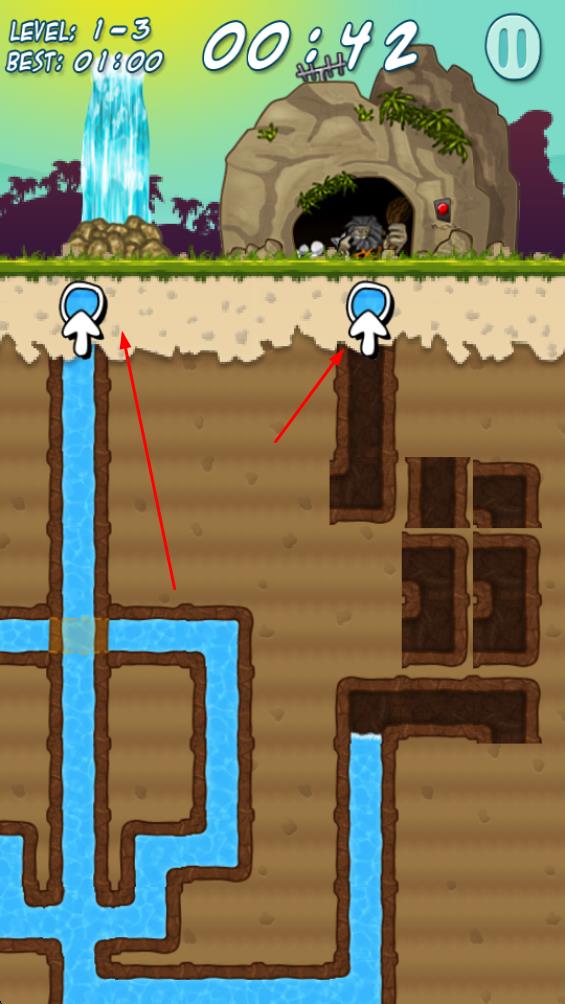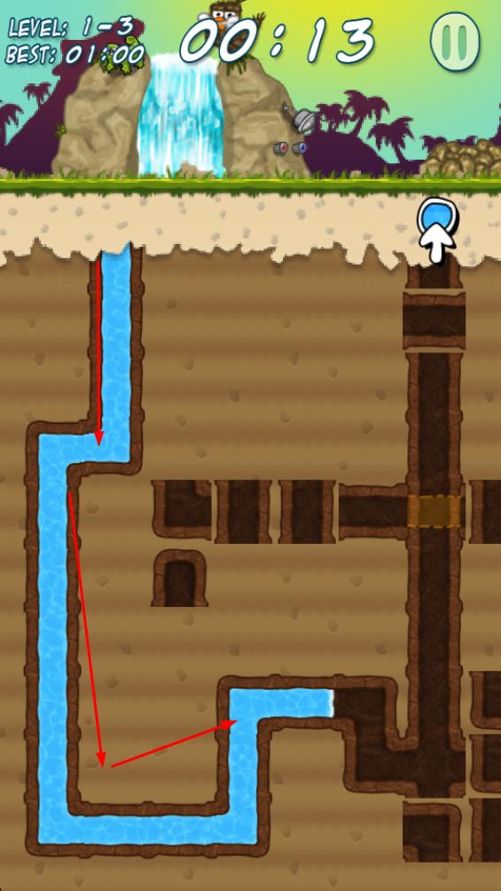 1、進(jìn)入關(guān)卡如1-3后,規(guī)劃水渠路徑,引導(dǎo)瀑布水流向目標(biāo)出口,挖掘土壤開辟通水通道,為后續(xù)連通打基礎(chǔ)。
