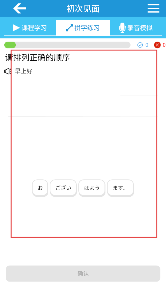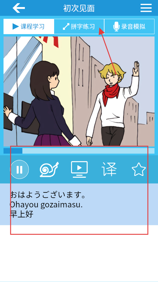 2、學(xué)習(xí)中日語的早上好,還可點(diǎn)擊拼字練習(xí),進(jìn)行拼字練習(xí)準(zhǔn)備。