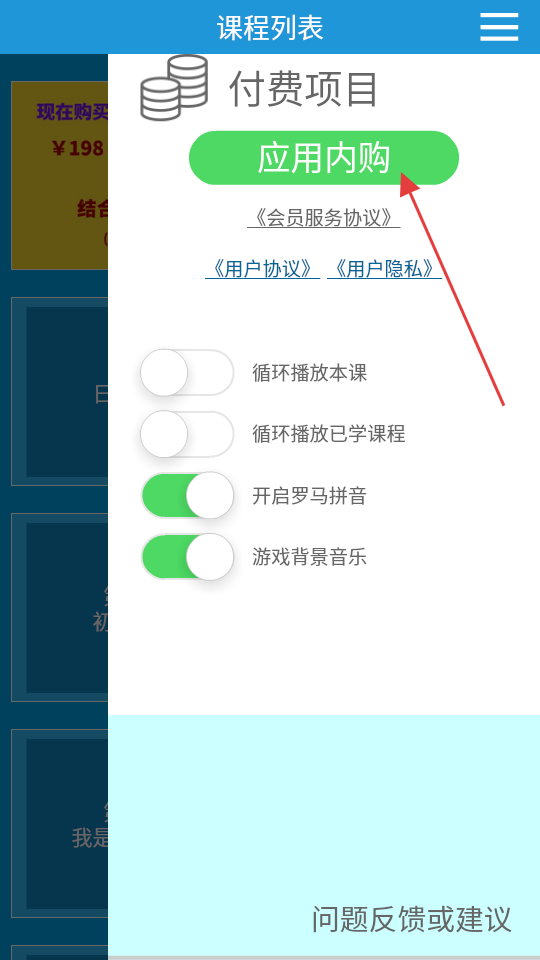2、在功能菜單中,點擊應(yīng)用內(nèi)購,進入付費項目頁面。