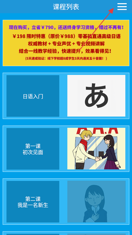 1、打開日語入門到精通,點擊右上角菜單按鈕,展開功能菜單。