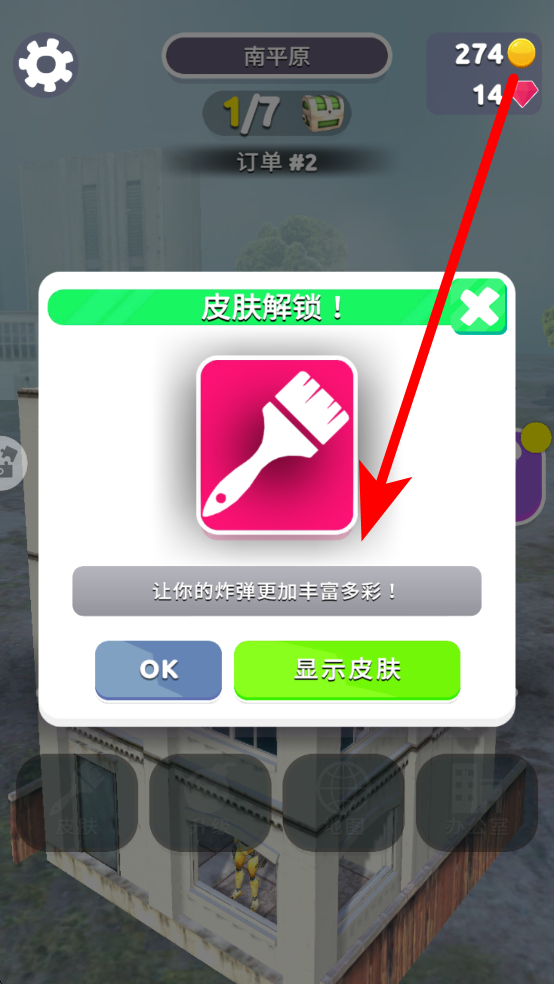 2、在完成訂單等操作過程中,會(huì)有皮膚解鎖的提示,當(dāng)皮膚解鎖后,可選擇查看皮膚,炸彈等豐富多彩,增添破壞時(shí)的視覺趣味。