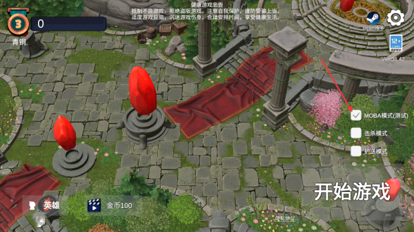 1、進(jìn)入界面查看左側(cè),確認(rèn)游戲模式,如MOBA模式,點(diǎn)擊開始游戲準(zhǔn)備選擇英雄。