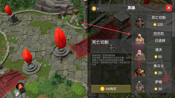 2、點(diǎn)擊英雄按鈕,花費(fèi)金幣購買或選擇已有的英雄,比如巴巴烈,查看英雄技能說明以了解其戰(zhàn)斗特性。
