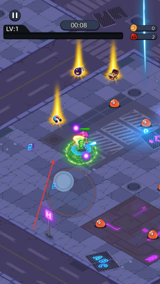 1、操控角色移動(dòng),留意屏幕上方信息,躲避敵人攻擊并收集道具,提升角色生存能力。