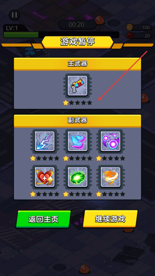 2、點(diǎn)擊暫停按鈕查看武器界面,依據(jù)主武器和副武器星級(jí)情況,選擇升級(jí)高星級(jí)武器,增強(qiáng)戰(zhàn)斗輸出能力。