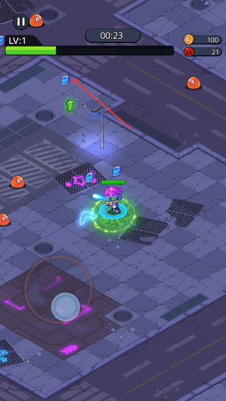 3、通過移動(dòng)躲避敵人,收集藍(lán)色道具等資源,利用升級(jí)后的武器攻擊敵人,爭(zhēng)取提升等級(jí),存活更長(zhǎng)時(shí)間。