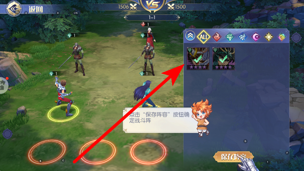 2、在布陣界面里,從角色列表中選擇合適的角色,將其部署到戰(zhàn)斗位置上,選好后點擊保存陣容,確定戰(zhàn)斗陣容,讓角色以精心安排的陣容迎接戰(zhàn)斗。