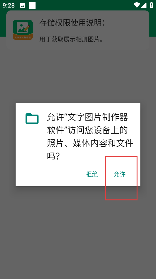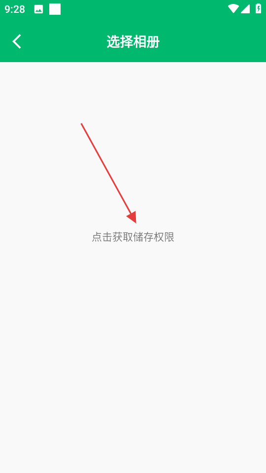 2、在選擇相冊頁面,點擊點擊獲取儲存權(quán)限,彈出存儲權(quán)限開啟提示框。
