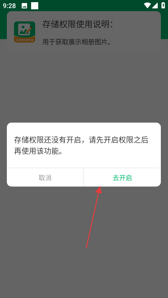 3、在存儲權(quán)限提示框中,點擊去開啟,進入權(quán)限授予頁面。