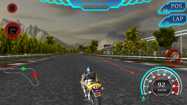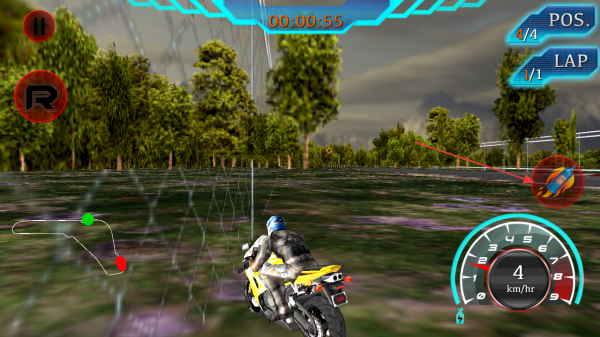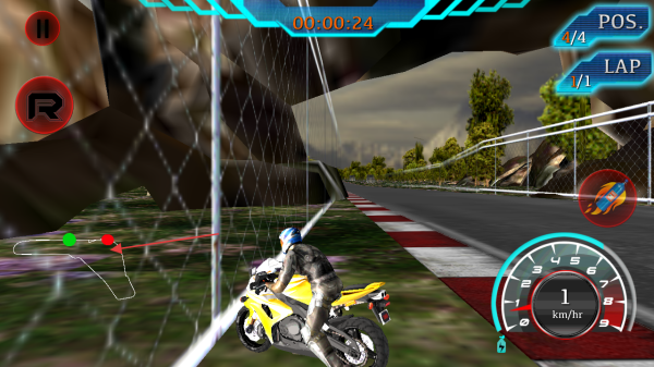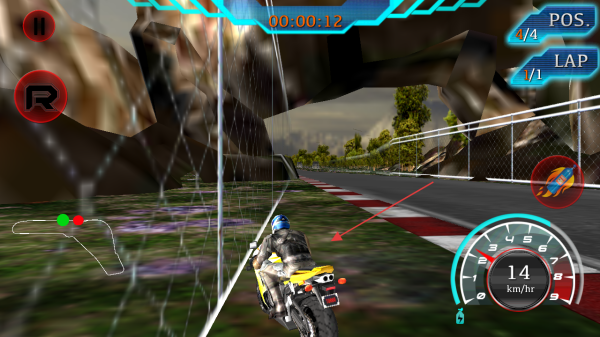 1、進(jìn)入游戲,留意屏幕上方顯示的時間00:00:12、排名POS.1/4和圈數(shù)LAP1/1,操控摩托車起步,通過左側(cè)虛擬按鍵控制方向。