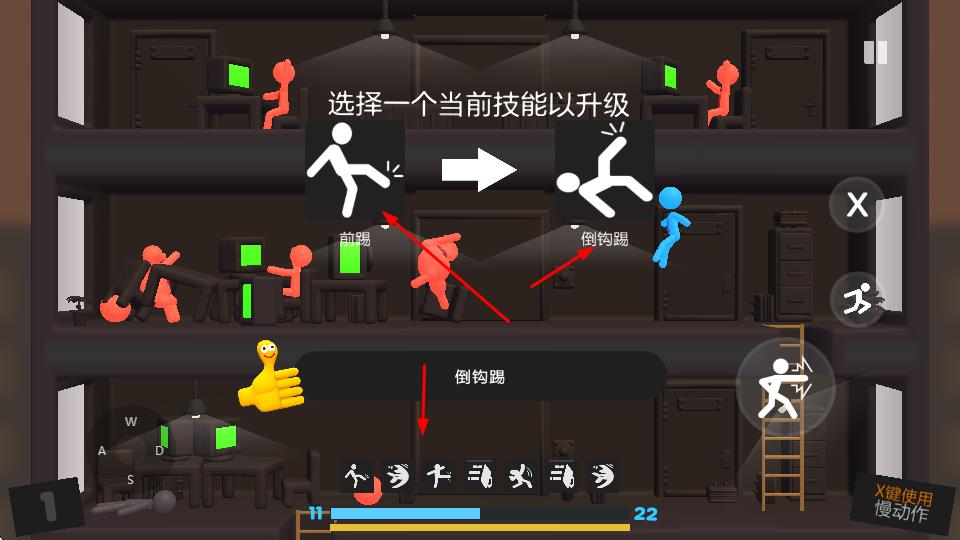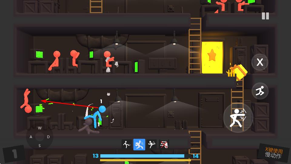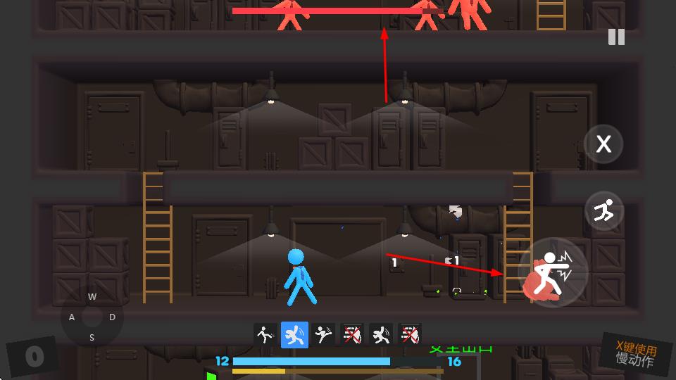 1、在多層場景中,操控藍(lán)色火柴人移動,利用左側(cè)方向鍵調(diào)整位置,點(diǎn)擊右側(cè)戰(zhàn)斗按鈕與敵人交戰(zhàn)。