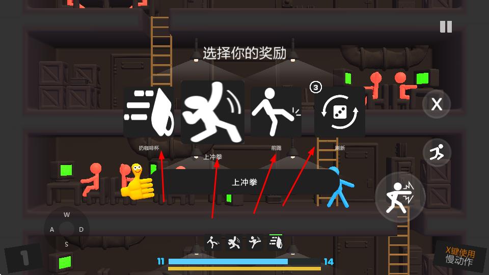 2、戰(zhàn)斗后可選擇獎勵,如扔咖啡杯,上沖拳,前踢等技能,獲取新能力助力后續(xù)戰(zhàn)斗。