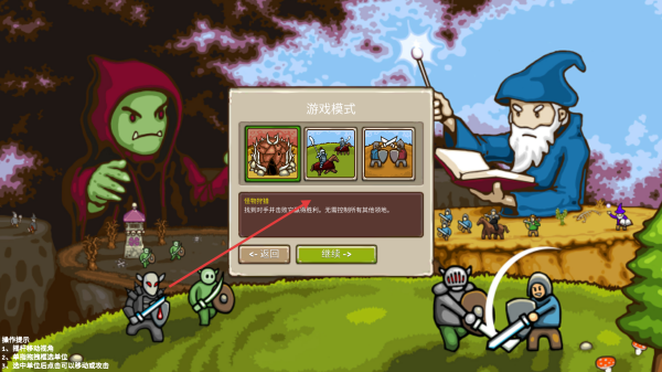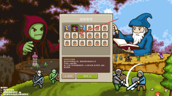 1、點(diǎn)擊選擇首領(lǐng)界面,選擇已解鎖的首領(lǐng),不同首領(lǐng)有不同技能,如提示中提到的增加經(jīng)驗(yàn)獲取、提升法術(shù)研究概率等,選好后點(diǎn)擊繼續(xù)。