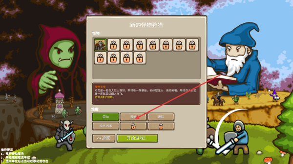 3、來(lái)到新的怪物狩獵界面,選擇要狩獵的怪物,可先從簡(jiǎn)單難度入手,選好難度點(diǎn)擊開始游戲。