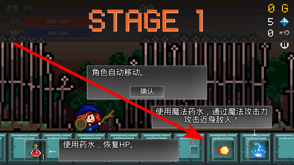 3、開始會有操作提示,比如角色自動移動,同時要留意道具的使用,像使用藥水可恢復(fù)生命值,使用魔法藥水能借助魔法攻擊力攻擊近身敵人。