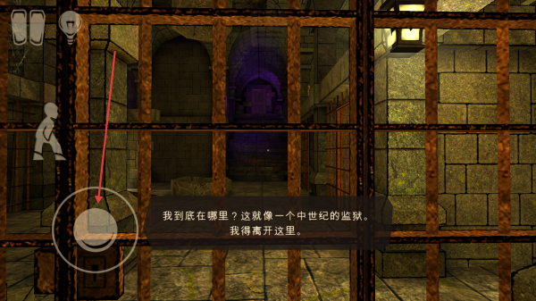 4、利用屏幕左下角的虛擬搖桿控制角色移動(dòng),探索如中世紀(jì)監(jiān)獄般的場(chǎng)景,根據(jù)任務(wù)提示和對(duì)話信息,尋找逃離的方法。