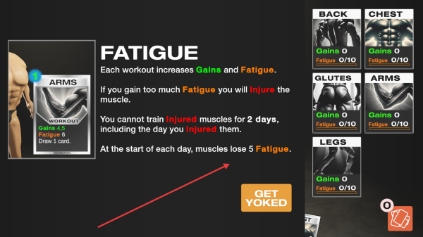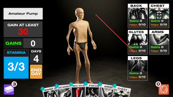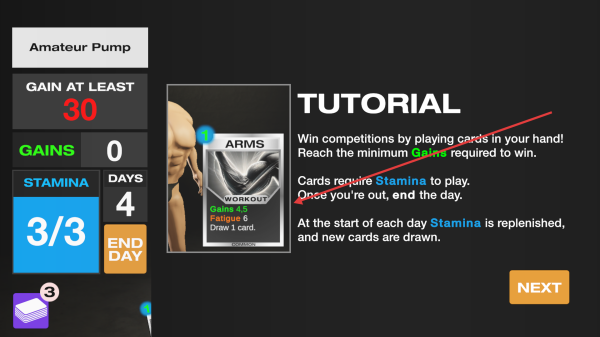 2、根據(jù)教程提示,出牌來贏得比賽,達(dá)成最低增肌要求,出牌需消耗耐力值,耐力耗盡點(diǎn)擊結(jié)束當(dāng)天訓(xùn)練。