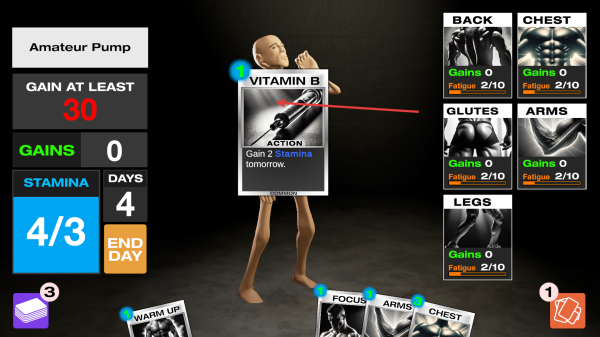 4、合理使用手中卡牌,如VITAMINB卡,按說明獲取相應(yīng)效果,比如增加明天的耐力值,規(guī)劃出牌策略以高效完成增肌目標(biāo)。