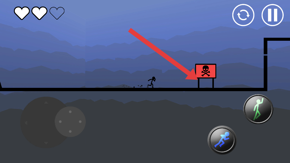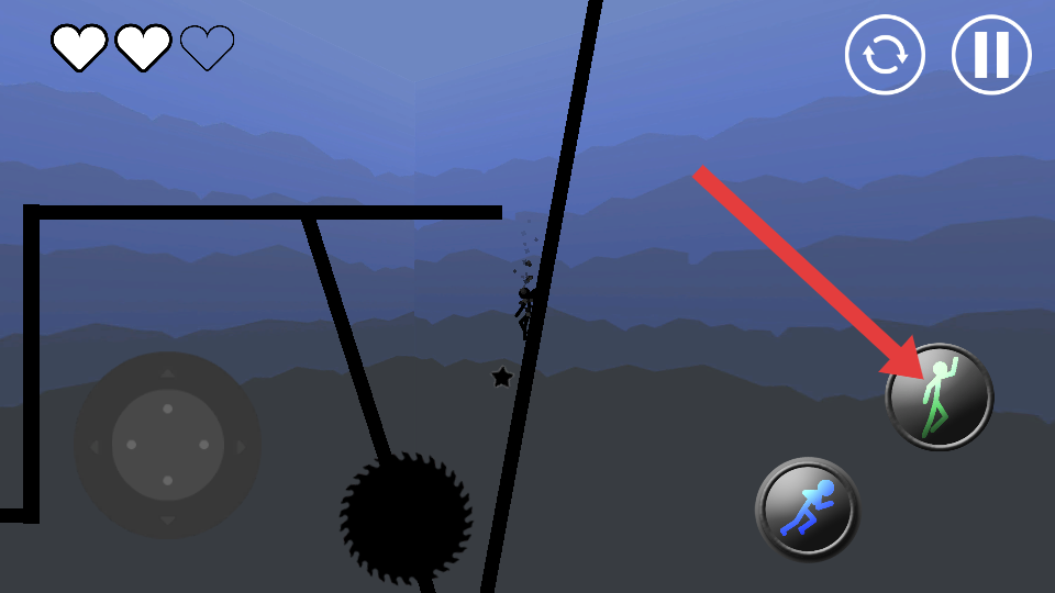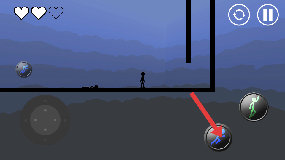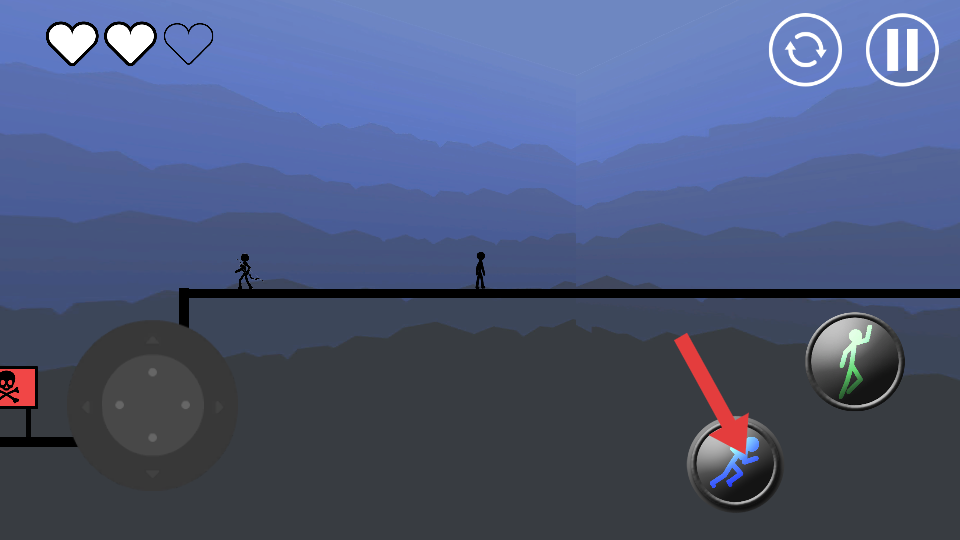 1、先通過左下角方向鍵調(diào)整火柴人角色的移動方向,配合右下角跳躍沖刺按鍵熟悉基礎(chǔ)位移操作,確保在平坦區(qū)域能靈活控制角色移動節(jié)奏。