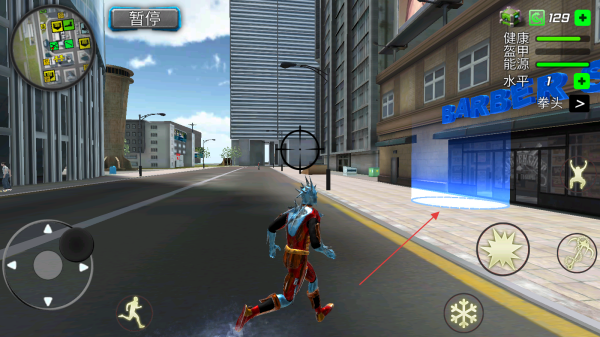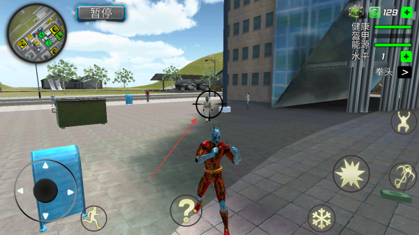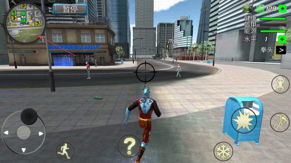 1、進(jìn)入游戲通過左側(cè)虛擬搖桿操控超級(jí)英雄移動(dòng),查看左上角小地圖規(guī)劃路線。