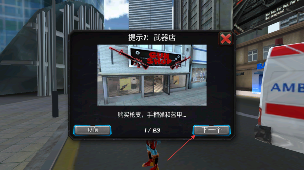 3、看到提示!武器店彈窗,點(diǎn)擊下一個(gè)了解更多信息,可前往購(gòu)買槍支等裝備。