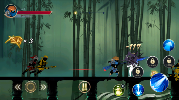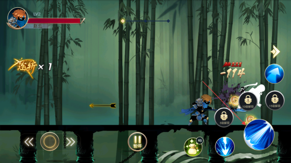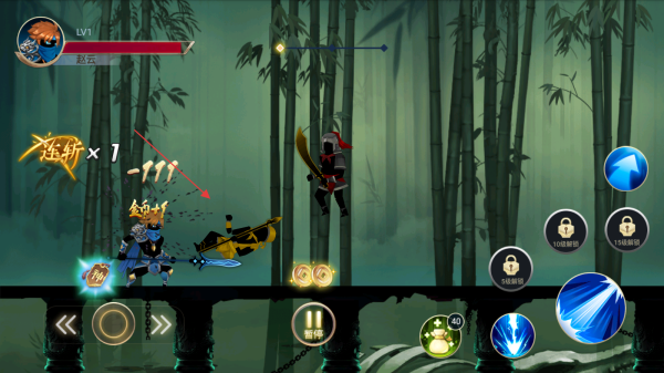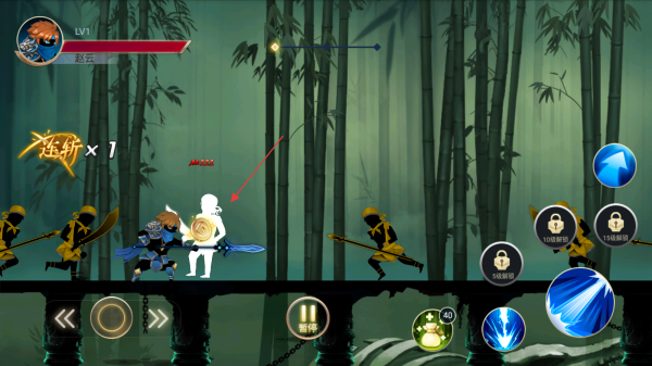 1、操控趙云進(jìn)入竹林關(guān)卡,留意自身Lv1等級(jí)和血量條,利用普攻按鈕攻擊前方白色敵人。