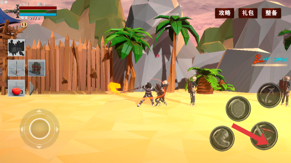 2、對戰(zhàn)時緊盯屏幕上方的生命值條與連擊數(shù),命中敵人可累積連擊數(shù),通過輕攻擊+移動調(diào)整位置+輕攻擊循環(huán)。