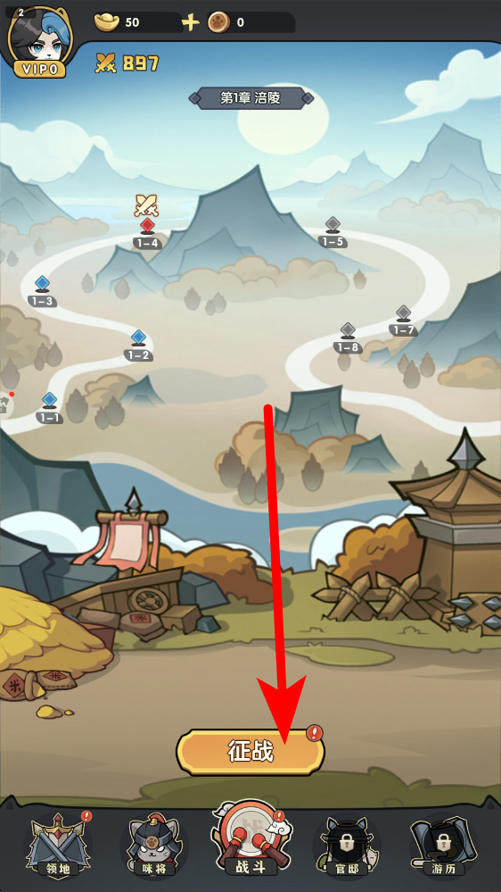 2、玩家游玩體驗(yàn),然后征戰(zhàn)挑戰(zhàn)關(guān)卡,在關(guān)卡選擇界面,點(diǎn)擊征戰(zhàn),進(jìn)入相應(yīng)的關(guān)卡,開(kāi)啟與敵人的對(duì)戰(zhàn),推進(jìn)游戲進(jìn)程。