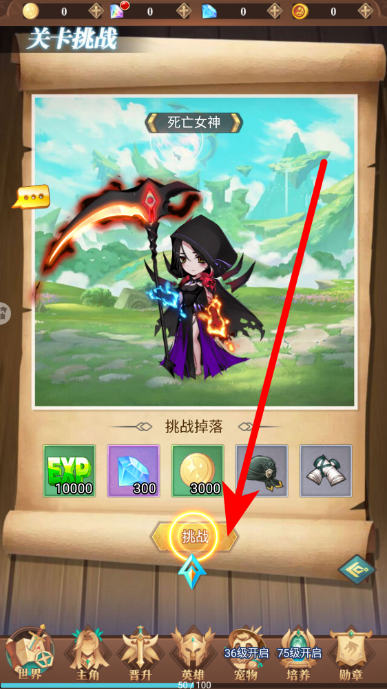 2、玩家然后點(diǎn)擊挑戰(zhàn)關(guān)卡,在關(guān)卡挑戰(zhàn)的界面,找到想要挑戰(zhàn)的關(guān)卡,點(diǎn)擊挑戰(zhàn),進(jìn)入關(guān)卡與敵人展開對(duì)戰(zhàn),推進(jìn)冒險(xiǎn)進(jìn)程。