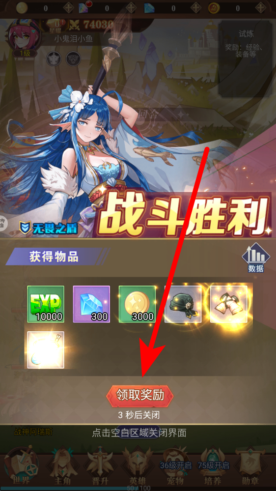 4、最后贏得勝利領(lǐng)取獎(jiǎng)勵(lì),成功擊敗敵人后,點(diǎn)擊領(lǐng)取獎(jiǎng)勵(lì),可獲得經(jīng)驗(yàn)金幣裝備等獎(jiǎng)勵(lì),助力角色成長(zhǎng),為后續(xù)冒險(xiǎn)提供支持。
