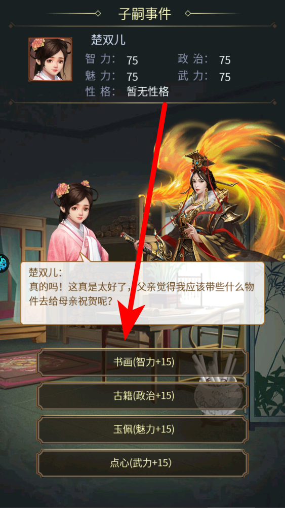 3、接著經歷子嗣事件,在游戲進程中,比如子嗣詢問給母親帶什么物品祝賀,可根據不同物品對應的屬性加成,選擇合適的物品,助力子嗣成長。