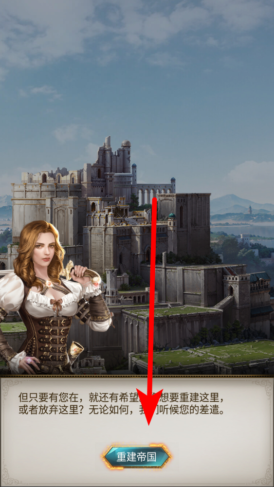 2、當(dāng)看到城堡相關(guān)場(chǎng)景及重建或放棄的詢問(wèn)時(shí),可根據(jù)自身想法,選擇重建帝國(guó),開(kāi)啟對(duì)帝國(guó)的重建之路,在新的階段開(kāi)展建設(shè)等操作。