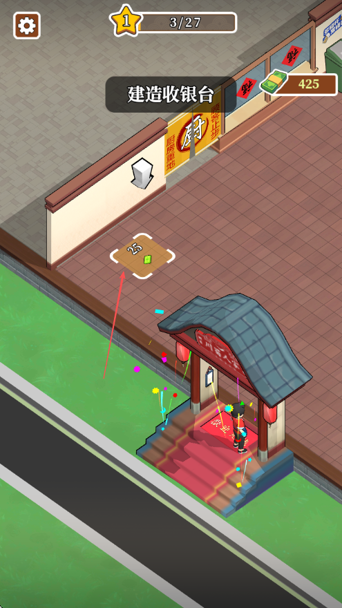 3、繼續(xù)按照游戲提示,花費(fèi)資金依次建造收銀臺(tái),為餐廳運(yùn)營(yíng)做準(zhǔn)備。