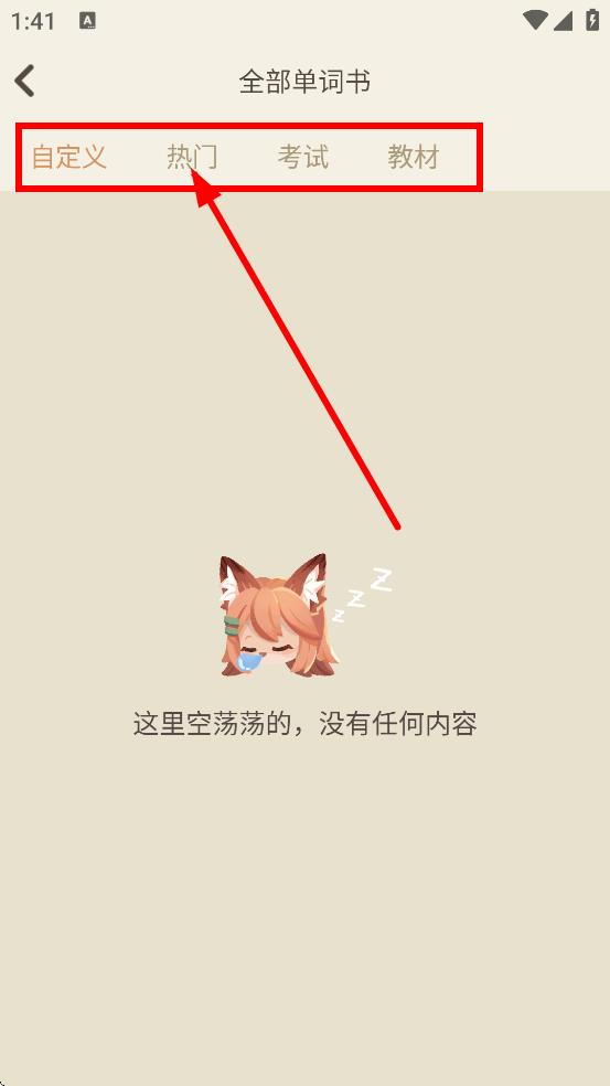 2、在全部單詞書頁面,可選擇自定義,熱門,考試,教材等分類。
