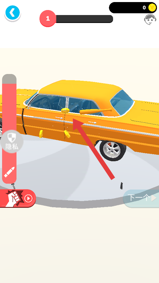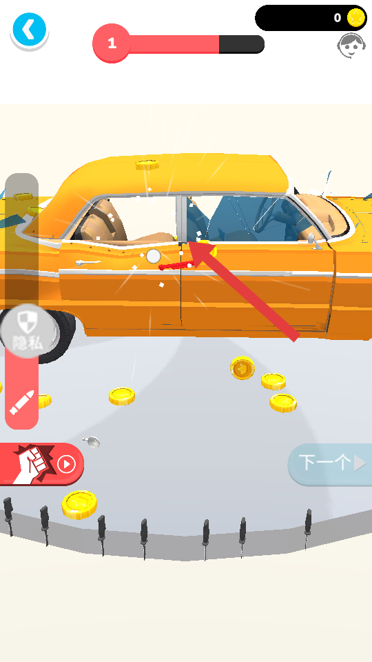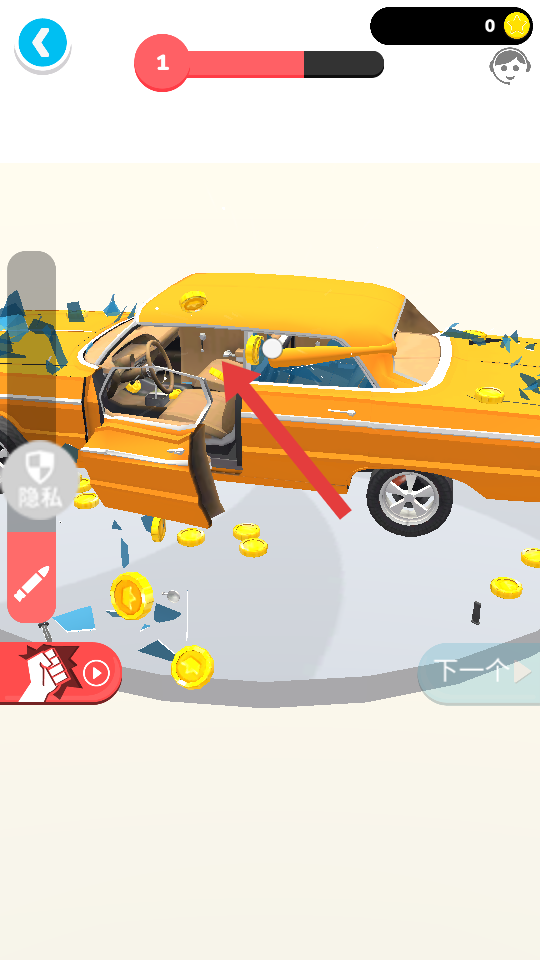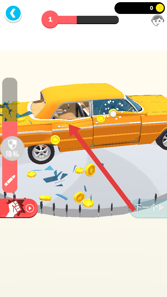 1、在破壞汽車游戲里,點(diǎn)擊或滑動(dòng)屏幕操控破壞工具,對(duì)準(zhǔn)黃色汽車進(jìn)行破壞操作,開啟獲取金幣的任務(wù)進(jìn)程。