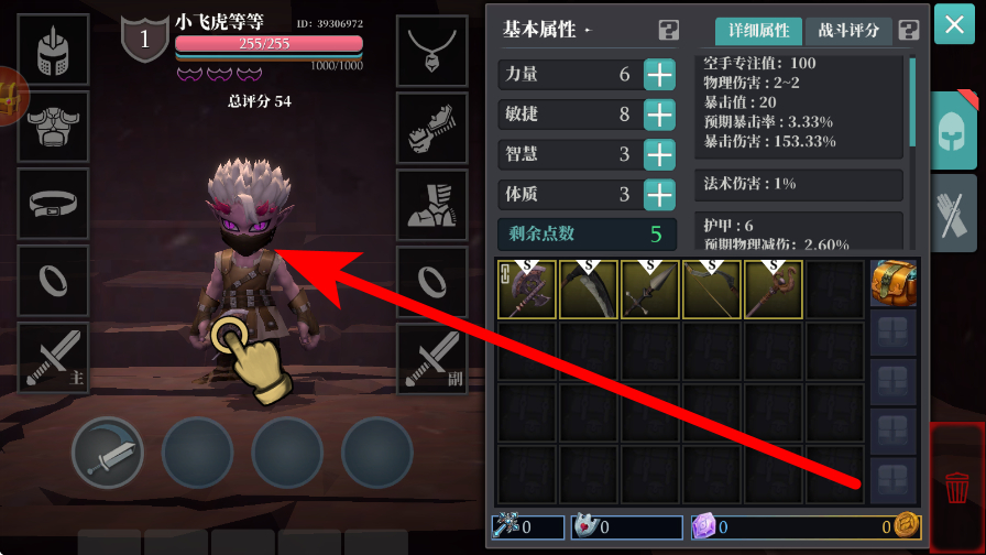 2、然后查看角色屬性,進(jìn)入角色界面,能看到力量敏捷智慧體質(zhì)等基本屬性,以及戰(zhàn)斗評分等詳細(xì)屬性,了解角色的能力情況。