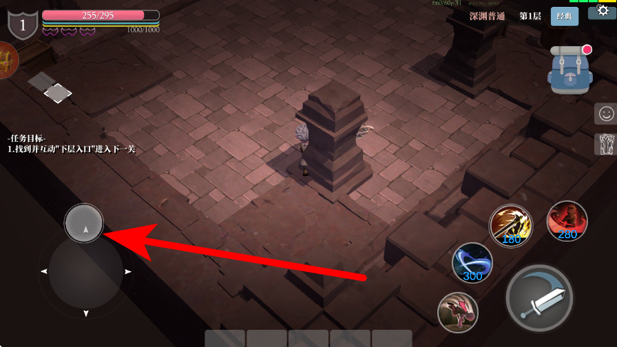 3、接著玩家可以開始移動,通過操作移動相關(guān)按鈕,控制角色在暗黑場景中移動,前往不同區(qū)域,探索場景中的各類元素。